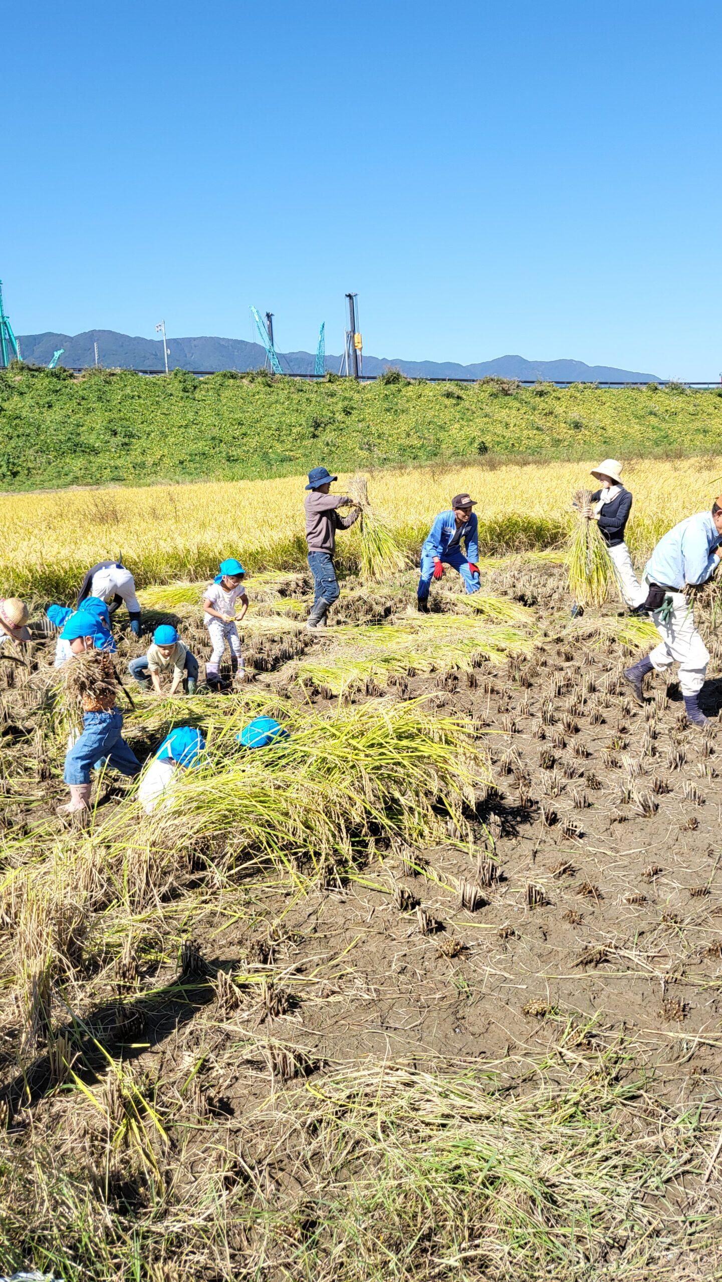 快晴のもと、地域の方と一緒に稲刈りをしました。